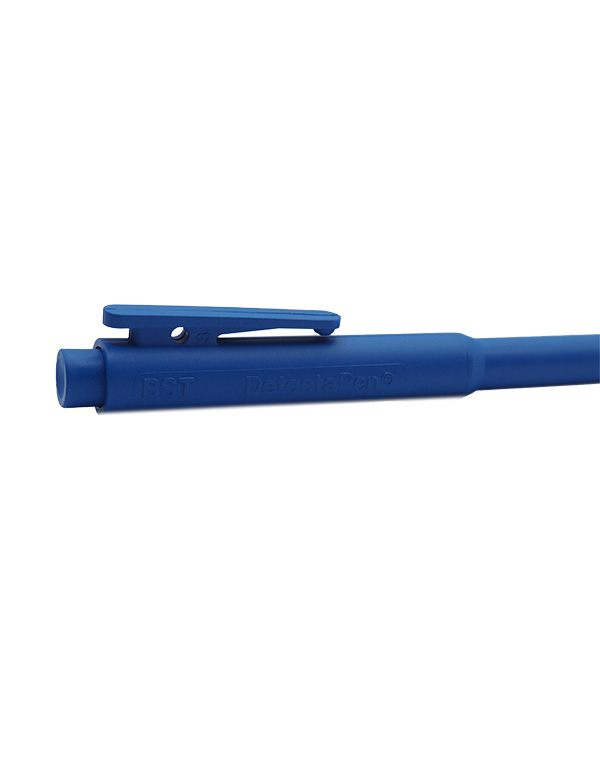 Retractable blue pen with clip, detectable by metal-detector and X-ray.